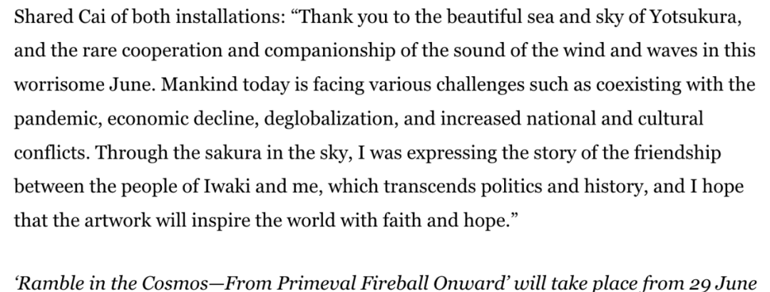 显然,这次活动没有让蔡国强团队对于“ 火药” 这种爆破性质的,具有一定危险性的物质对公共利益的影响,进行更谨慎的评估。