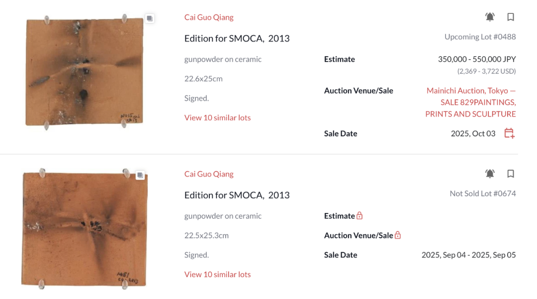 这些低于预估价格卖出,或者流派的作品,来自于 2013 年蔡国强为日本 iwaki 的美术馆 Snake Museum of Contemporary Art 的开幕式火药作品 (即在陶瓦片 terra cotta tile 上点燃火药后的印记作为悬挂艺术作品)