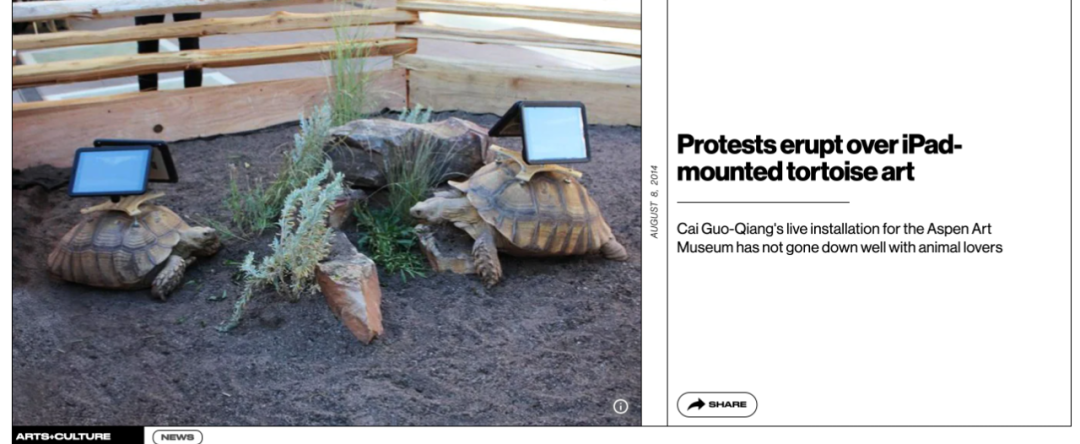2013 年,蔡国强在美国阿斯彭艺术博物馆的作品 《移动鬼城》 中,将 iPad 粘在苏卡达陆龟的龟背上,播放当地的“ 鬼城” 影像。此举遭到大量动物保护和环保组织的强烈抗议。