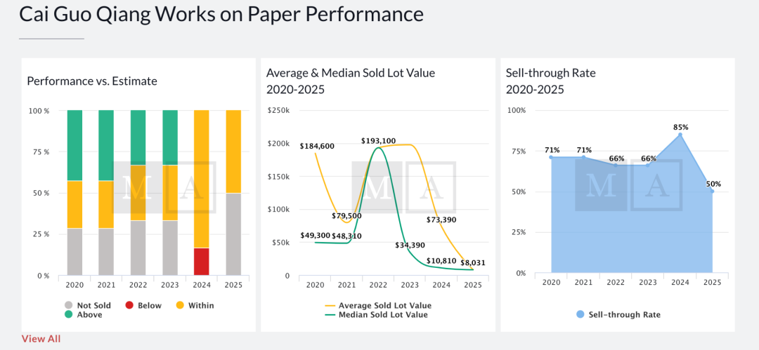 从纸上作品售价表现图表来看,蔡国强作品拍卖价格的高峰在 2022-2023 年,之后就低于预估价格,甚至在 2025 年出现将近一半 not sold(流拍) 作品。