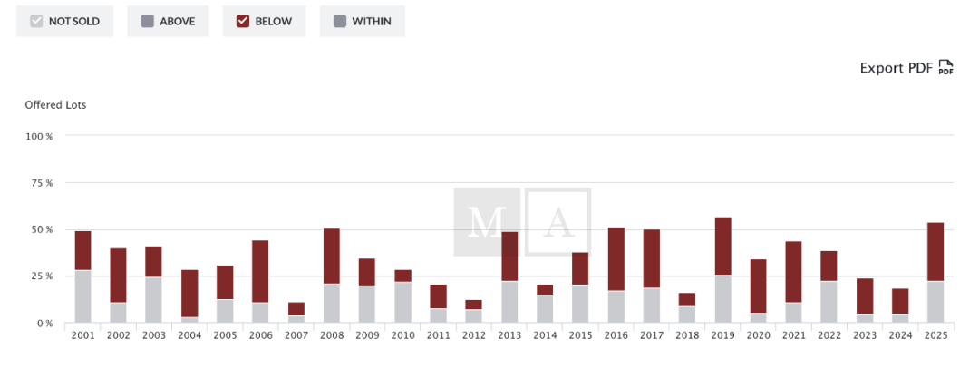 和股市一样,拍卖市场是公开的。每一次流拍,每一次低于预期的成交,都在向全世界的藏家传递一个冰冷的信号:曾经的“ 价值共识” 正在瓦解。