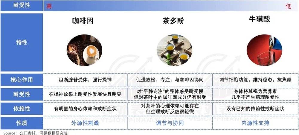 毕竟能量饮料配方主打 「牛磺酸+咖啡因」,其中牛磺酸是天然存在于人体内的氨基酸,摄入后更不容易产生耐受性。且目前能量饮料远不如茶咖流行,对大多数人来说,提神效果依旧 「立竿见影」。