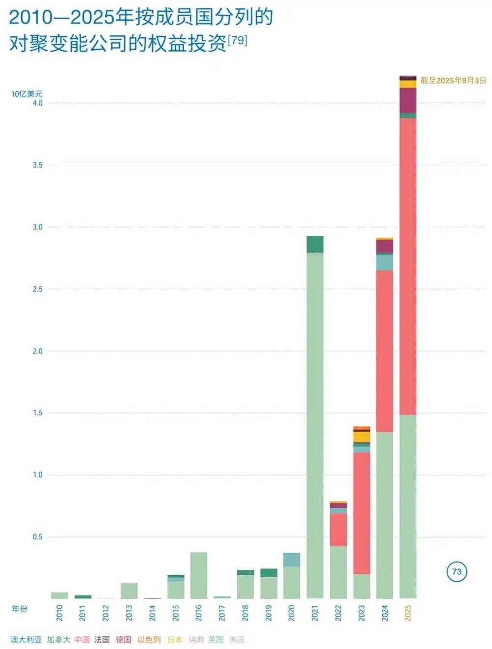 尽管在这个领域,中国的累计融资金额 (约 50 亿美元)仍然不及美国 (约 75 亿美元),但是据 IAEA 的报告,自 2023 年起,中国每一年的融资额都超过了美国。