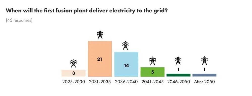 产业界的共识正在逐步成型。据美国核聚变产业协会 (FIA)的调研,全球 45 家受访聚变初创企业中,有 21 家认为会在 2030 年代初首次发电,其中,有 3 家认为将早于 2030 年。