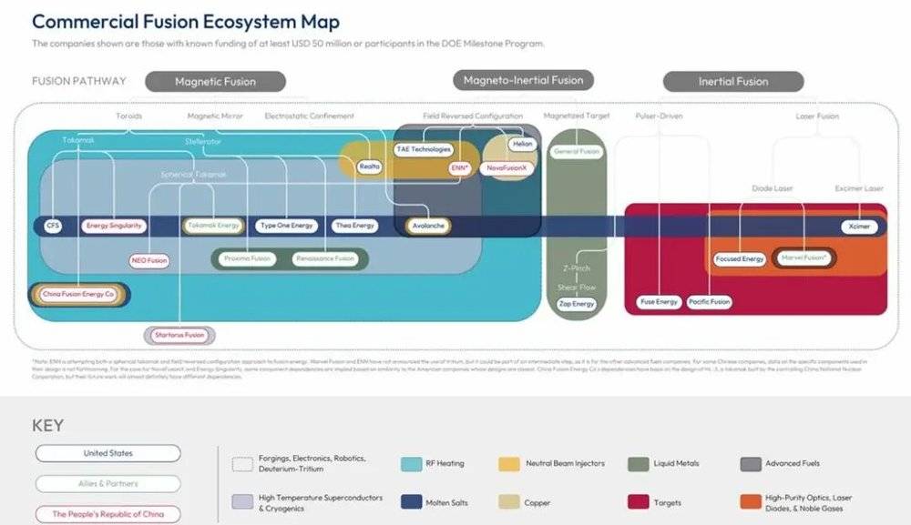 美国的报告对中国的砸钱力度感到震惊,认为自 2023 年以来,中国为支持各种核聚变路线的基础设施,已经调动了高达 130 亿美元的资金。仅中国聚变能源公司的注册资本,就差不多是美国能源部 (DOE)聚变能源科学 (FES)项目全年预算的 3 倍。该报告呼吁美国政府一次性拨款 100 亿美元来填补缺口;只靠风险资本是不够的。报告称,中国有多个投资规模超过 20 亿美元的项目;而美国目前只有一个,就是 15 年前建成的 NIF。