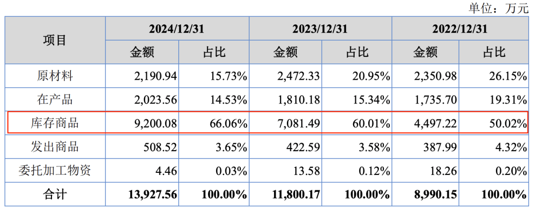 招股书显示,新天力的库存商品在存货的占比逐年升高,报告期内分别为 50.02%、60.01% 及 66.06%。