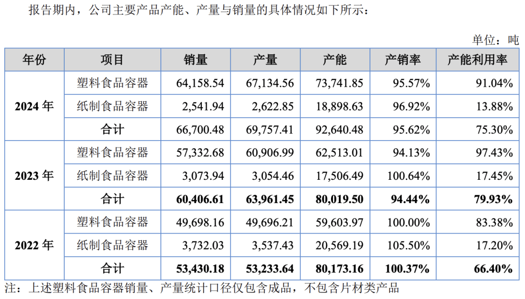 招股书还披露,报告期内,新天力的塑料食品容器产能利用率分别为 83.38%、97.43% 及 91.04%。但综合产能利用率并不高,分别为 66.4%、79.93% 及 75.3%。