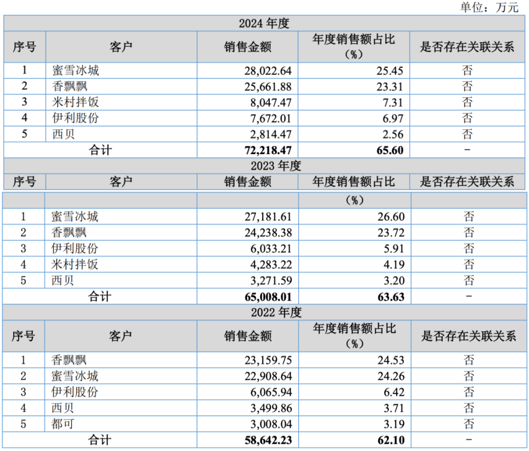 从新天力披露的信息可以看到,公司还十分依赖前两大客户蜜雪冰城和香飘飘,在报告期内,这两大客户合计占新天力销售收入的比重分别为 48.79%、50.33% 和 48.76%。