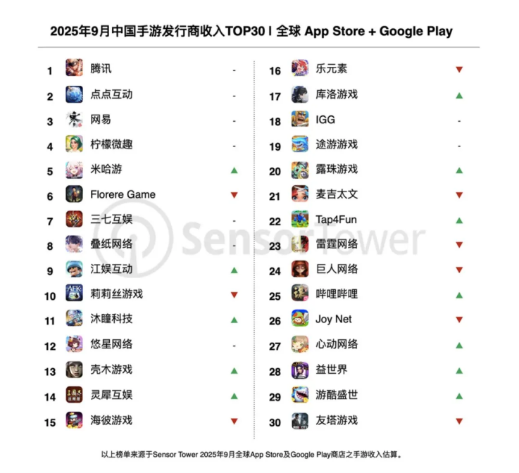 Sensor Tower 的数据显示,2025 年 9 月中国手游发行商全球收入总榜,腾讯、点点互动、网易位居排行榜前三,呈现三足鼎立之势。