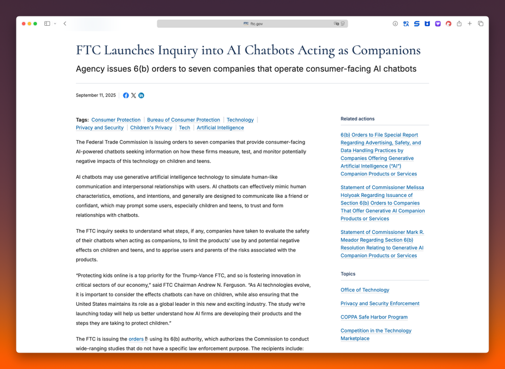 美联邦贸易委员会 (FTC)9 月开始对 OpenAI、Alphabet、Meta 等 7 家科技公司展开调查,以评估 AI 聊天机器人对儿童和青少年的潜在负面影响。FTC 认为,AI 聊天机器人通常被设计得能够像朋友一样交流,可能会导致儿童及青少年与聊天机器人建立情感依赖。