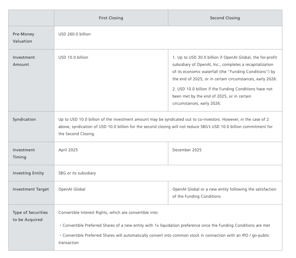 这些钱都还是期货。即便是软银领投的 400 亿美元 (其中软银出资 300 亿美元)也计划分批支付。第一笔将只支付 100 亿美元,需要 OpenAI 在今年底满足一定融资条件才完成第二笔支付。