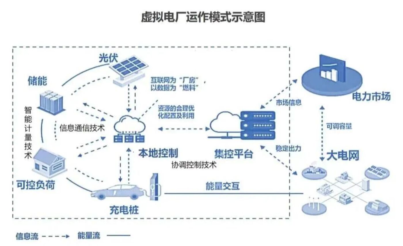 正因如此,虚拟电厂备受瞩目。它通过信息技术和软件系统,实现分布式电源、储能、可调负荷等多种分布式资源的聚合和协同优化。作为一个特殊的电厂,它既可以作为 「正电厂」 向系统供电调峰,又可作为 「负电厂」 加大负荷消纳配合系统填谷。