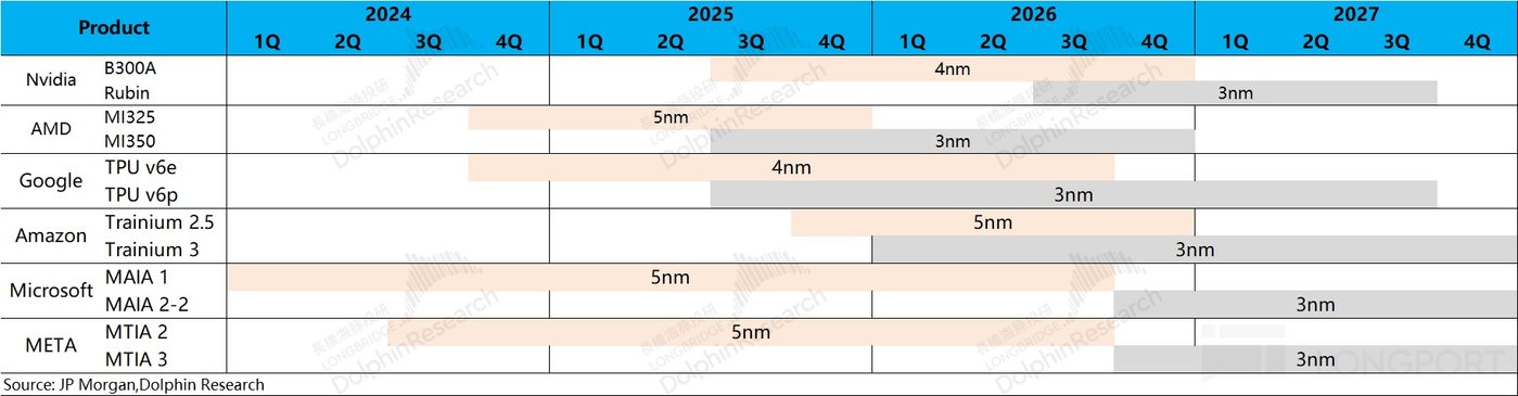 b) 制程工艺迭代升级:目前公司 2nm 进展顺利,预计 2026 年苹果、高通等手机芯片将采用 2nm 制程工艺,而 AI 芯片 (博通、AMD、英伟达等厂商) 也将在 2025 年下半年开始从 4nm 平台逐步迁移至 3nm 工艺。