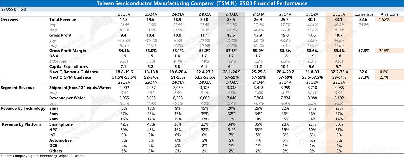 台积电 (TSMC) 于北京时间 2025 年 10 月 16 日下午的美股盘前发布了 2025 年第三季度财报 (截止 2025 年 9 月),要点如下: