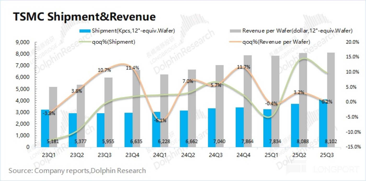 从量价关系看 (等效 12 寸片):①$台积电 (TSM.US) 的晶圆出货量 4085 千片,环比增长 9.9%;②台积电的晶圆单晶圆收入 (等效 12 寸片)8102 美元/片,环比增长 0.2%。