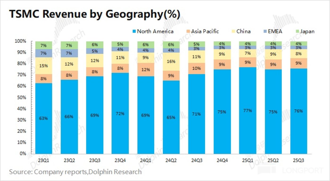 从各地区收入来看,北美地区仍是台积电最大的收入来源,收入占比为 76%。这是由于北美地区有苹果、英伟达、AMD、高通等大客户,使得台积电和美国之间有很强的商业绑定关系。