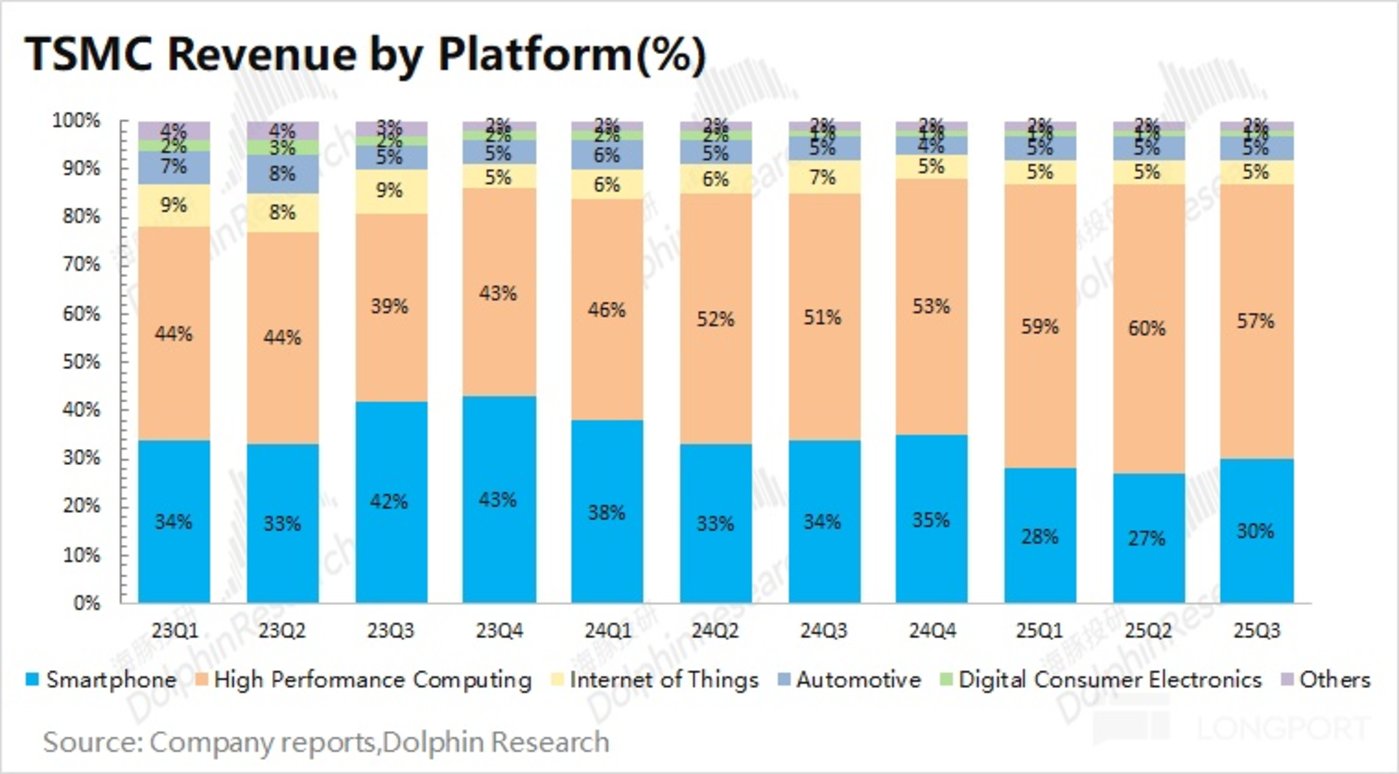 b. 下游应用端:公司本季度收入环增的主要来自于机业务,其中 iPhone 新机备货是主推力。受英伟达、博通等 AI 芯片需求的带动,高性能计算依然是公司最大的收入来源,本季度达到 189 亿美元,收入占比 57%。