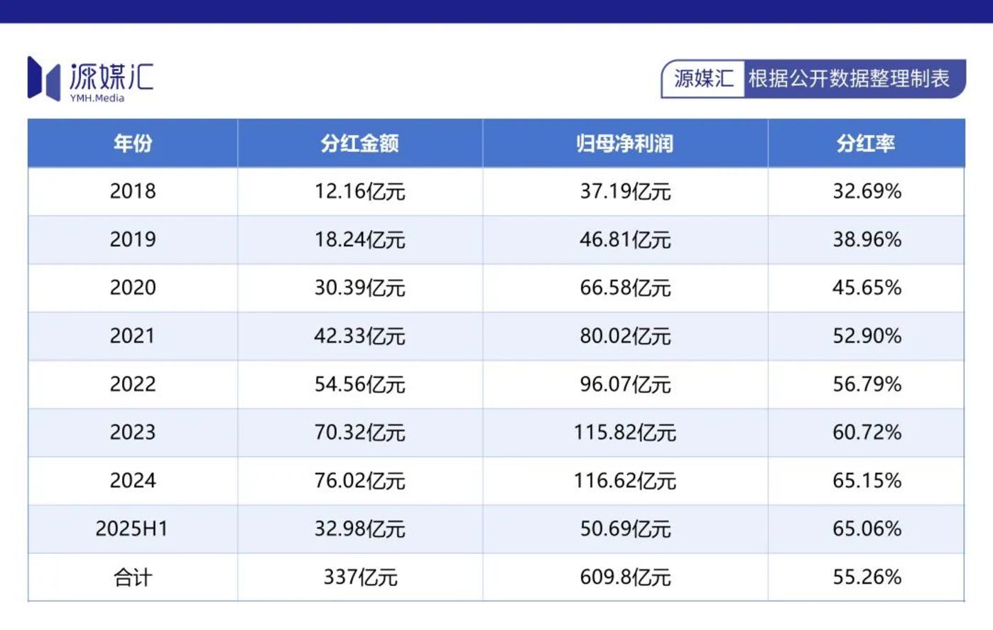 A 股上市 7 年多以来,迈瑞医疗累计分红金额高达 337 亿元,是其上市融资金额 59.3 亿元的 5.7 倍。这种 「赚钱能力强、分红比例高」 的特质,与多数企业上市 「补血」 的目的形成鲜明对比。