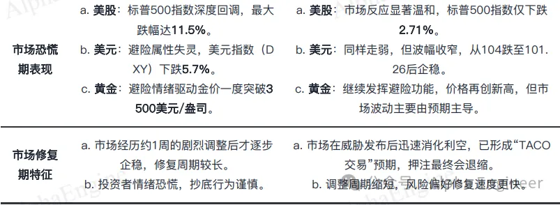 TACO 1.0 属于单一博弈。这个模式主要围绕单一的关税威胁展开,市场反应剧烈且迅速,通常在政策威胁后出现急跌,并在数日或一两周内快速修复,呈现出高波动、短周期的特征,典型代表是 2025 年 4 月的“ 解放日关税” 事件。
