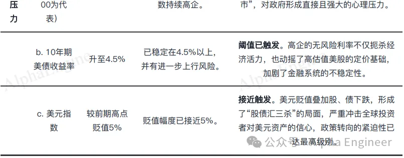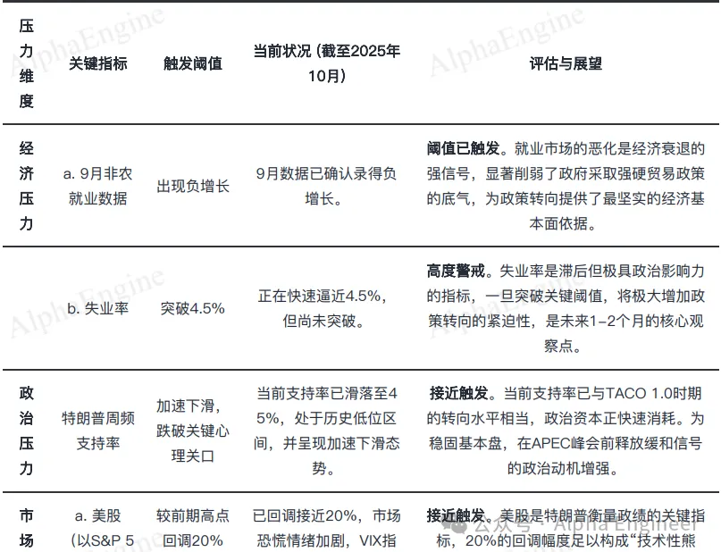 当这些维度的关键指标触及预设的“ 痛苦阈值” 时,政策转向的可能性将急剧升高。