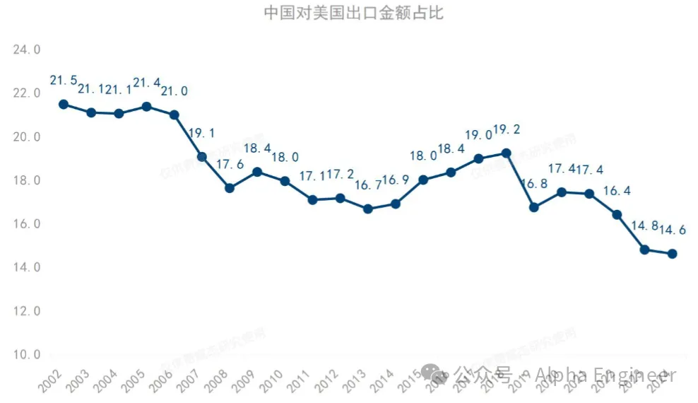 图:中国对美出口依赖度稳步下降,国信证券,AlphaEngine