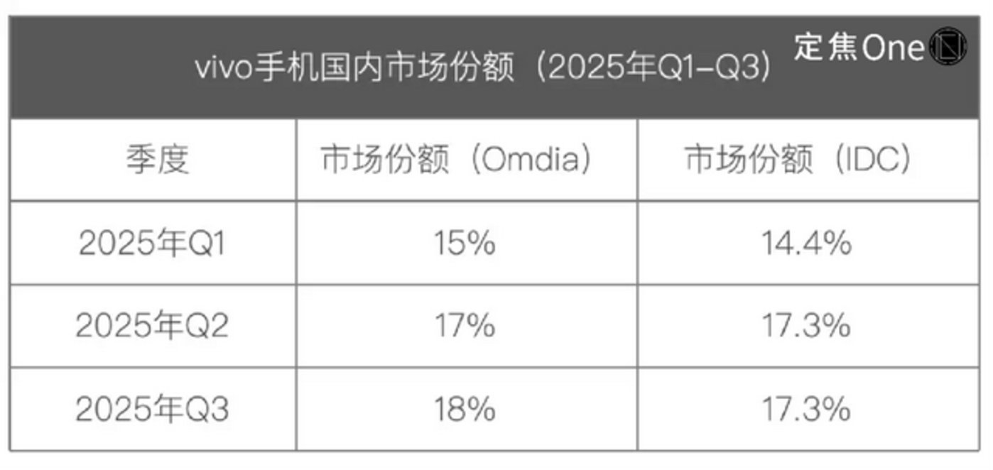 这次轮到 vivo。根据 Omdia 和 IDC 的数据,vivo 以 18% 左右的市场份额重返榜首。华为与苹果则在 15-16% 的区间内争夺第二、三名。