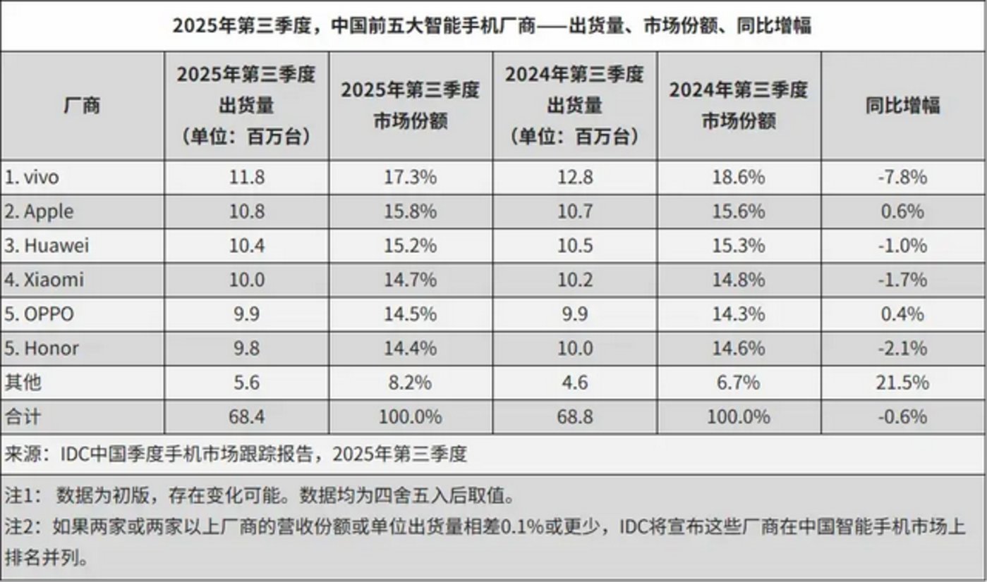 2025 年第三季度,中国手机市场同比下降 3%。根据 Omdia 分析师的观点:「年初国补带来的阶段性出货波动正在消退,市场节奏逐步回归常态。」 在这样的市场环境中,vivo、苹果、华为用不同的方式,守住了各自的市场份额。