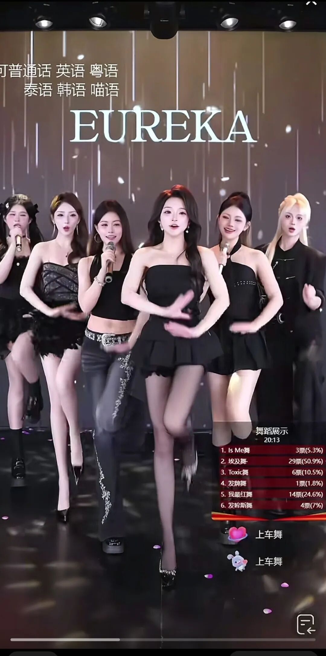 早期,上车舞的传播主要在 Eureka 直播间内,作为团播与粉丝互动的主要节目之一。这一阶段,上车舞的热度主要来源于 C 位程艺独特的声线和较强的业务能力,成员们不仅能用 5 国语言跳上车舞,还加入了能引起粉丝好奇心的 「喵语」,同时,中控画外音切入精准,与团队成员配合默契。