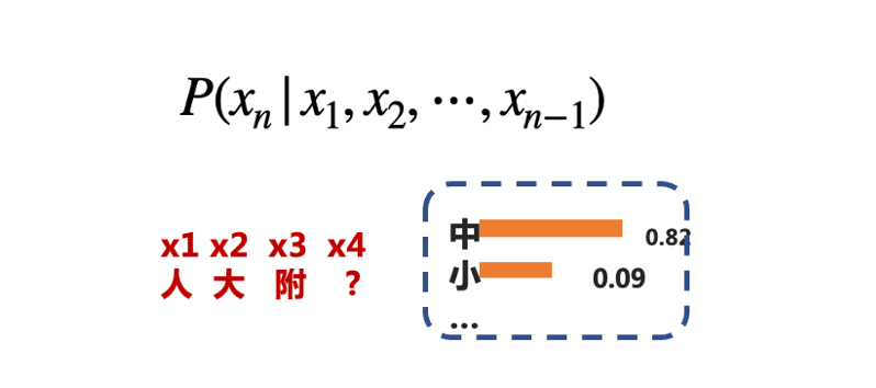 这个公式是什么意思呢?其实就是给定前 N 个单词或者前 N 个字母,去预测第 N+1 个单词或字母的概率是多少。举个例子,比如说前三个字是 「人大附」,那么第四个字到底是人大附中的 「中」,还是人大附小的 「小」 呢?大模型就会根据全文的情况去推测、预测,给一个概率,这个就是人工智能。