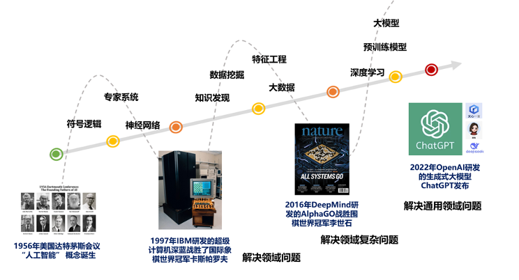 之后全球出现了百模大战,中国出现了 DeepSeek、豆包、文心一言、ChatGLM(智谱清言)等一大堆的模型,让我们看到了通用人工智能的曙光。