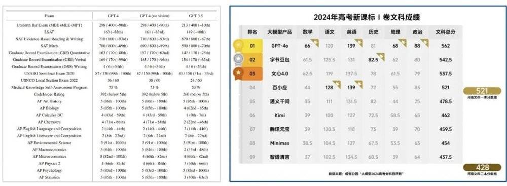 ▲左:GPT-4 的 SAT/GRE 成绩大致相当于能申请上美国 Top 30~50 的大学和研究生项目;右:四个 AI 大模型成功 「冲上一本线」,理科普遍不及格,大模型更像文科生