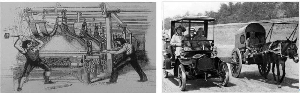 ▲左:卢德运动,1811 (Luddite Movement);右:汽车替代马车的时代启示