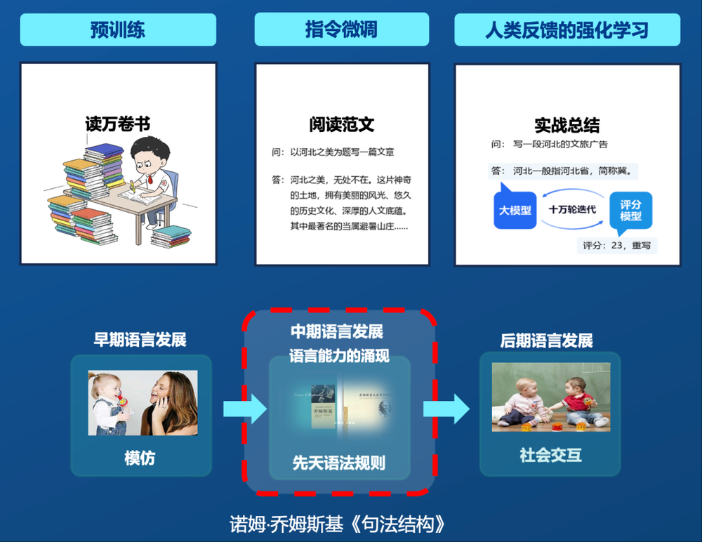 在这个过程中,我们还发现了一个非常有趣的现象:国外的大模型大量的训练数据是英文,但是它的中文却能说得很好。相反,中国的大模型主要的训练数据是中文,但它的英文也能说得很好。这说明,人类的语言可能在基础语法上是相通的。这个也印证了美国著名语言学家诺姆·乔姆斯基,在著作中提到的先天语法树理论。