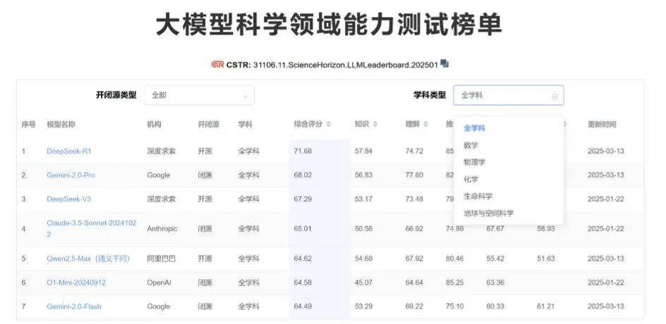 我们去看一下大模型在数理化天地生各个不同领域的学科能力到底怎么样。那么有了这样一个平台,我们就知道以后在做不同的研究时,要用什么样的人工智能了。