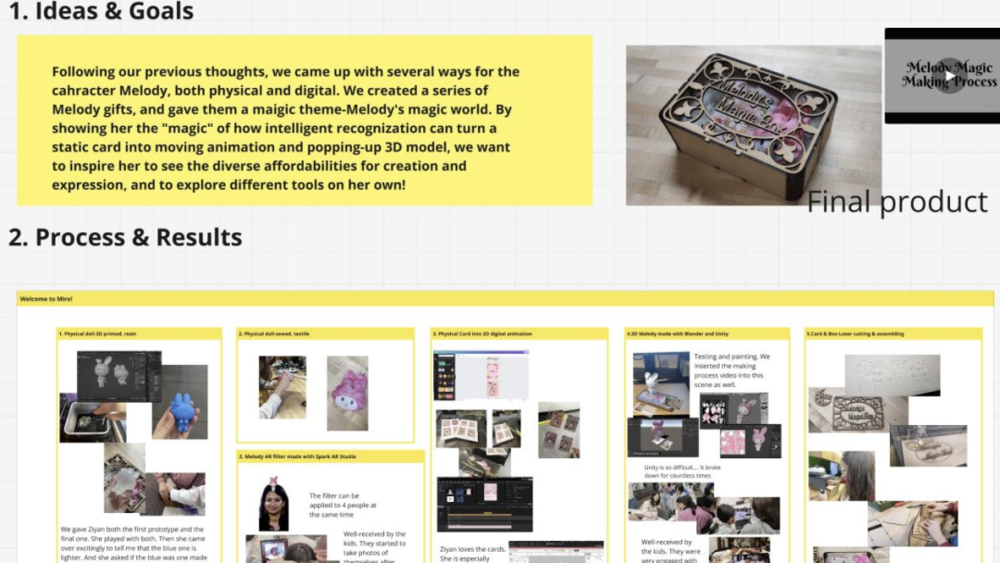 李熙晨和几位同学组建 「Melody 小组」,用不同材料与技术把那只兔子重新 「造」 出来:3D 打印、激光切割、布艺、木工、AR 影像……他们反复试验比例、材质和结构,还做了一个 「魔法盒子」:只要打开,就能看到不同版本的 Melody,有的在发光,有的能动,有的只是安静地坐着。