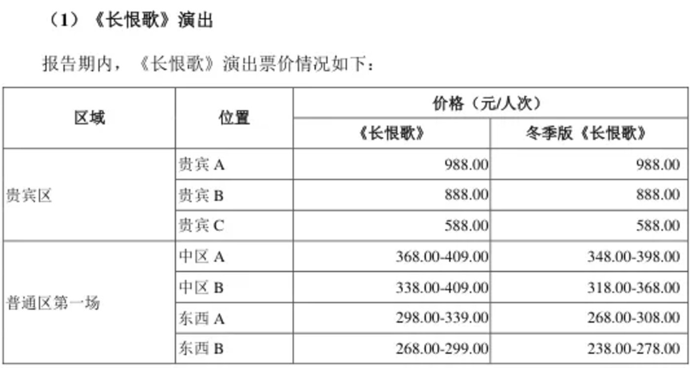 招股书显示,《长恨歌》 贵宾区 A 位置的价格已经接近 1000 元,普通区第一场的价格也在 268 元至 409 元之间。