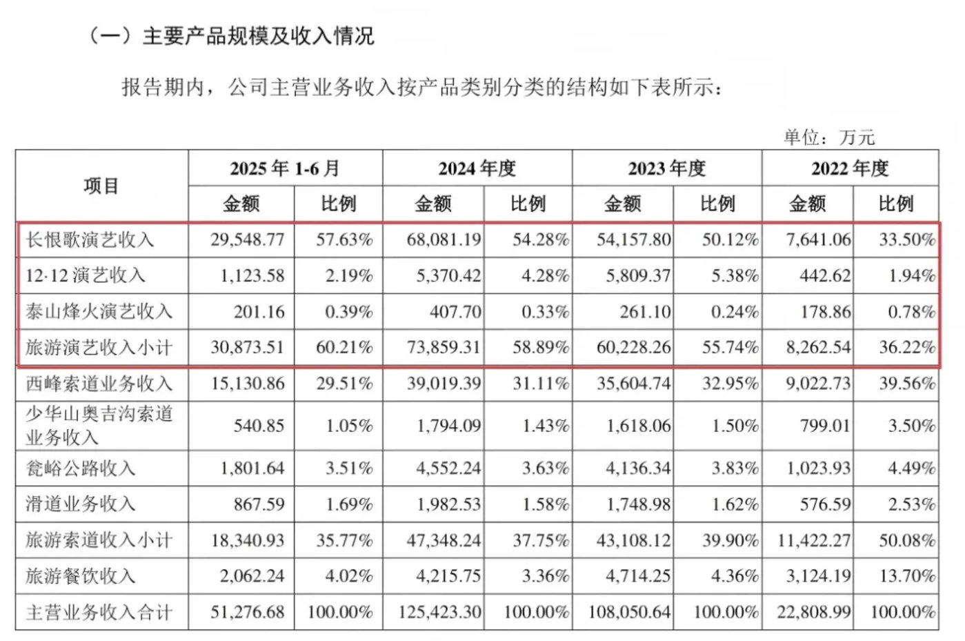2022 年、2023 年、2024 年及 2025 年 1-6 月,《长恨歌》 演艺收入的营收占比从 33.5% 提升至 57.63%,占比较大;旅游索道的营收占比从 50.08% 降至 35.77%,旅游餐饮的营收占比也有所下滑。