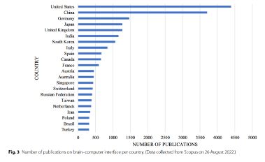 事实上,2023 年以来,全球脑机接口研发进度集中度直接指向中美两国,中美在专利数量、企业规模和融资规模上领先全球,形成第一梯队。如下图所示,早在 2022 年,中美在该领域的论文数量已经断层领先其他国家。