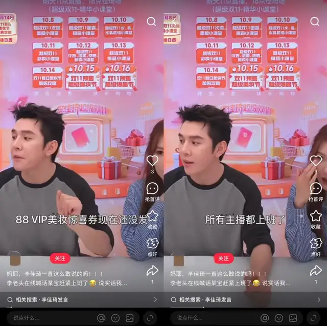 十一期间,李佳琦在直播间读到用户关于平台优惠券未发放的抱怨,直接隔空喊话:“ 淘宝直播、天猫老板,上班了!所有主播都上班了!” 随即有用户评论:“ 李佳琦不如自己开个平台。” 这句调侃,也是直接道出了头部主播在当前电商生态中的变化。