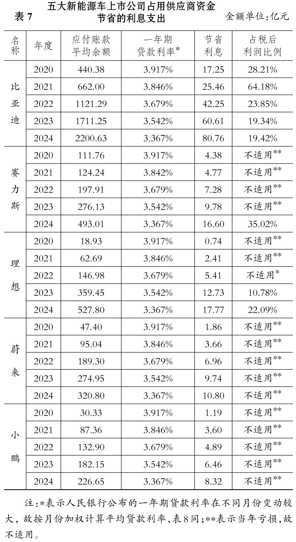 其中,上汽集团 2024 年占用供应商资金的效果最为突出:2529.24 亿元的资金占用节省利息支出 85.16 亿元,占其税后利润的比例高达 145.99%。倘若没有 OPM 战略带来的利息支出节约效应,上汽集团 2024 年的经营将由盈转亏。