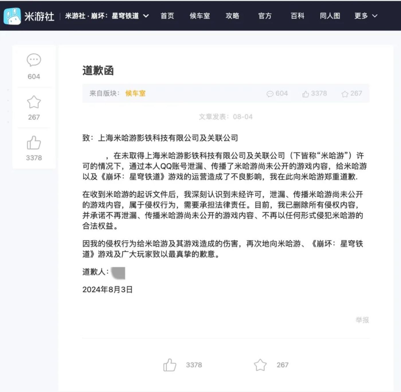 此前,米哈游为旗下热门游戏 《崩坏:星穹铁道》 招募了多名玩家参与了测试,并要求参与者对未公开的游戏内容签署保密协议。2023 年 10 月至 2024 年 2 月期间,玩家陈某先后 8 次前往游戏测试机房参与测试,于此期间携带电子设备对测试内容进行了偷录、偷摄,并多次向第三人披露游戏内容。