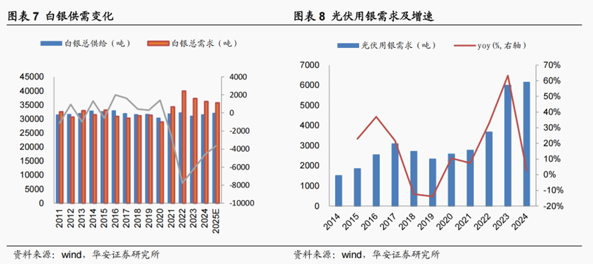 世界白银协会的数据显示,全球白银自 2021 年以来均呈现供不应求的状况,且预计 2025 年仍有 3660 吨供需缺口。供需差主要来自光伏需求的提升,2024 年全球光伏用银量 6147 吨,2014 至 2024 年间光伏用银需求量 CAGR 为 15.09%。