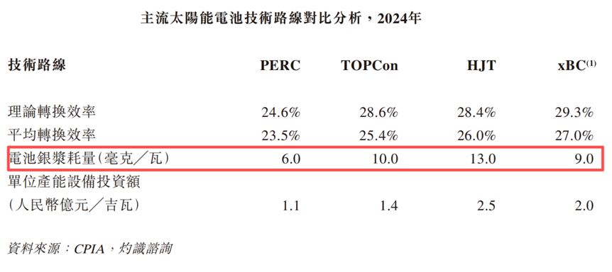 日御光伏的招股说明书显示,2024 年,无论是 TOPCon、HJT 还是 BC 技术比传统的 PERC 技术相比,银浆消耗量都是大幅提升,此外双面组件的出现也会将需求继续抬高,甚至于备受关注的钙钛矿叠层技术也需要银浆导电。