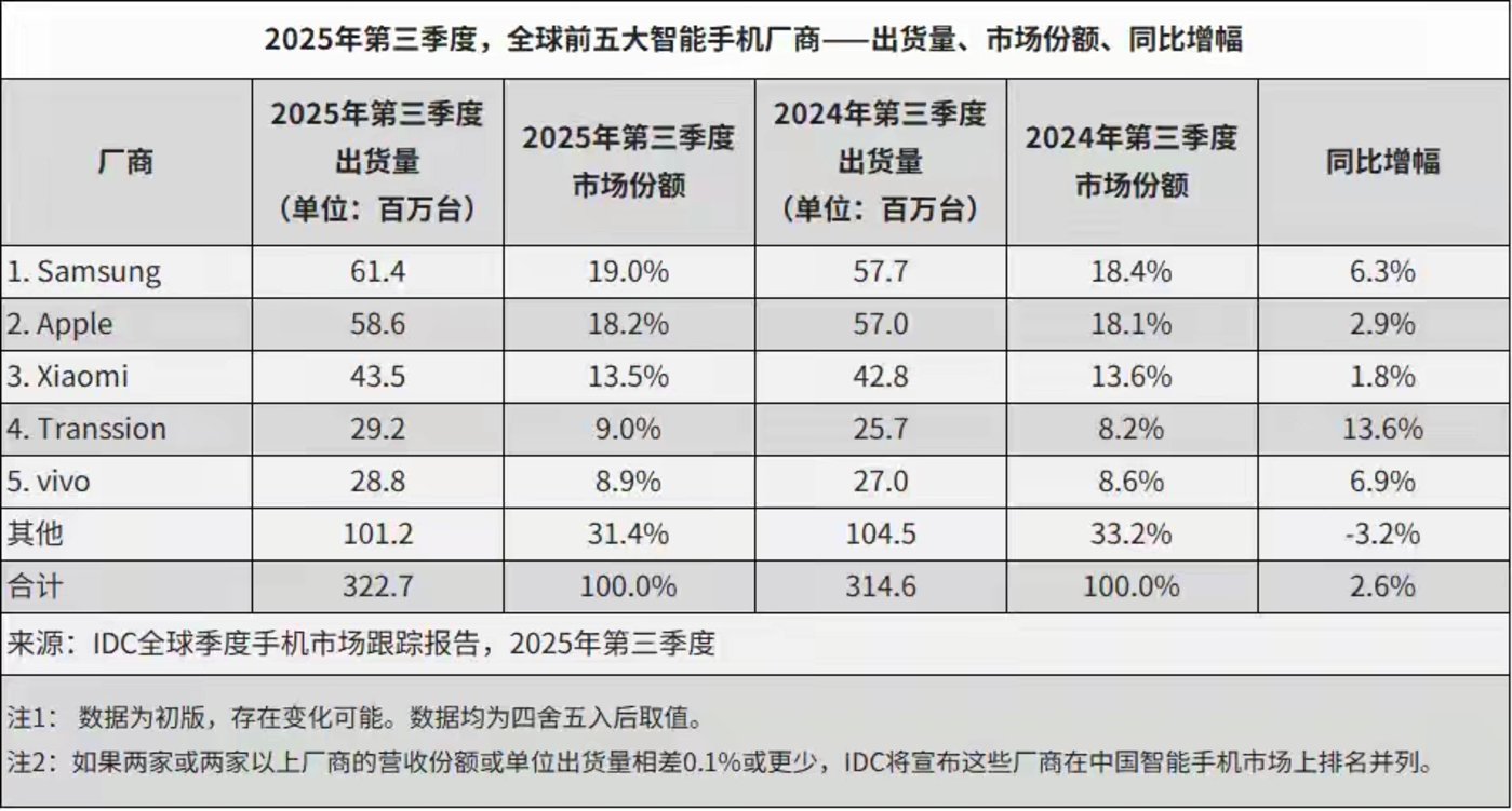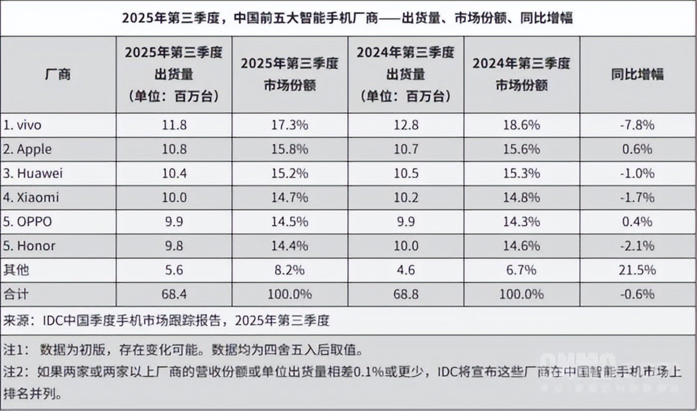 即便不谈高端,小米在全球市场手机出货表现尚可,在国内市场则还有距离,IDC 数据显示,小米手机出货量从第一季度的第一名下滑至第三季度的第四名。