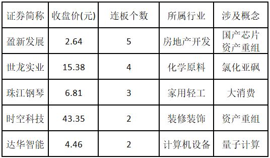从连板情况来看,今日首板个股有 47 只;2 连板的个股有 7 只;3 连板及以上的个股有 3 只。今日连板数排名前 5 的个股包括盈新发展、世龙实业、珠江钢琴、时空科技、达华智能,具体如下表所示。