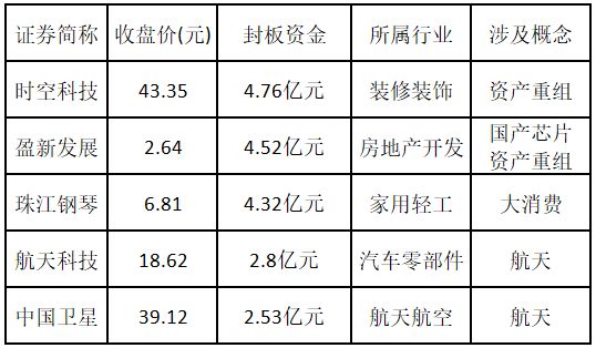 从封板资金来看,今日涨停板个股中,封板资金排名前 5 的个股包括时空科技、盈新发展、珠江钢琴、航天科技、中国卫星。