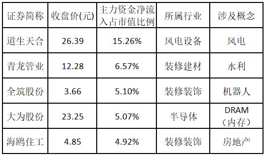 主力资金净流入金额占市值比例排名前 5 的个股分别为道生天合、青龙管业、全筑股份、大为股份、海鸥住工。欢迎大家关注微信公众号 「道达号」,其 「道达涨停复盘」 栏目为大家解读。