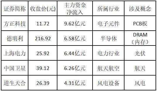 从主力资金来看,今日涨停板个股中,主力资金净流入金额排名前 5 的个股分别为方正科技、德明利、上海电力、中国卫星、道生天合。