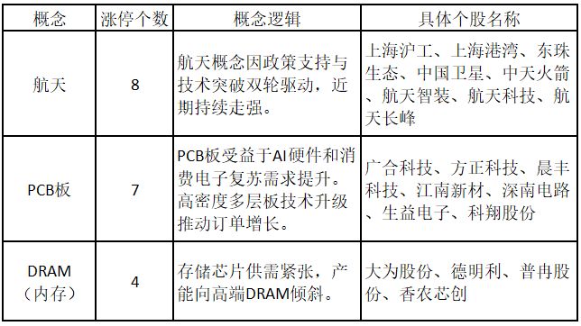 从概念特征来看,今日涨停板个股中,航天、PCB 板、DRAM(内存) 概念的个股最多。