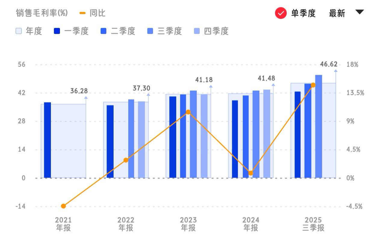 财报期内,药明康德盈利能力持续优化,第三季度毛利率达到 46.62%,创近五年单季毛利率新高。